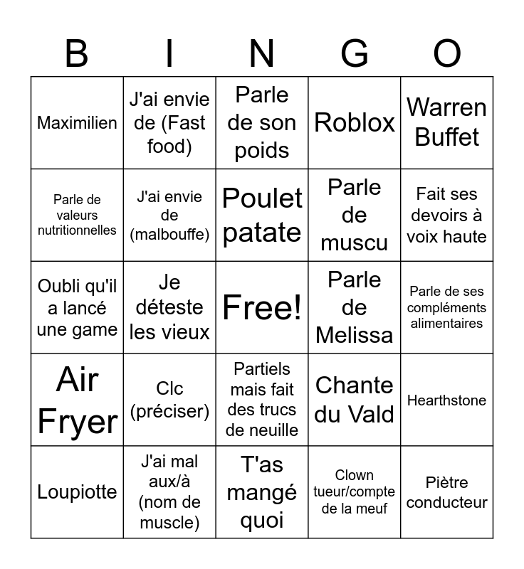 This bingo card has a free space and 27 words: Chante du Vald, Mentionne un chef pour décrire son repas, Parle de muscu, T'as mangé quoi, Parle de valeurs nutritionnelles, Parle de son poids, J'ai envie de (Fast food), Air Fryer, Parle de Melissa, Hearthstone, Oubli qu'il a lancé une game, Roblox, Loupiotte, J'ai mal aux/à (nom de muscle), Fait ses devoirs à voix haute, Tu vas manger quoi, J'ai envie de (malbouffe), Poulet patate, Clc (préciser), Maximilien, Parle de ses compléments alimentaires, Clown tueur/compte de la meuf, Je déteste les vieux, Piètre conducteur, Partiels mais fait des trucs de neuille, Warren Buffet and Lance une game !.