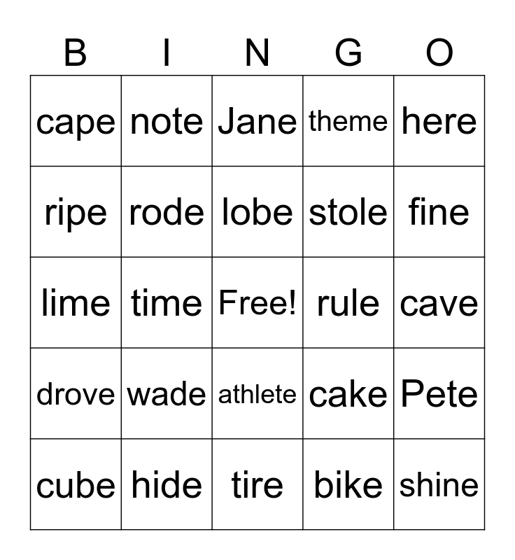 This bingo card has a free space and 24 words: wade, hide, lobe, cube, here, cape, ripe, note, rule, athlete, stole, lime, cake, Pete, rode, bike, cave, Jane, fine, time, shine, drove, theme and tire.