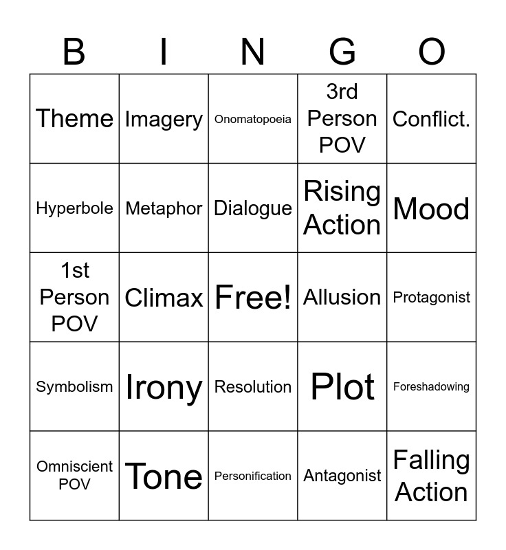 This bingo card has a free space and 27 words: Plot, Setting, Rising Action, Personification, Hyperbole, Onomatopoeia, Imagery, Symbolism, Allusion, Foreshadowing, 1st Person POV, 3rd Person POV, Omniscient POV, Tone, Mood, Simile, Metaphor, Dialogue, Irony, Theme, Protagonist, Antagonist, Climax, Falling Action, Resolution, Conflict. and Exposition.