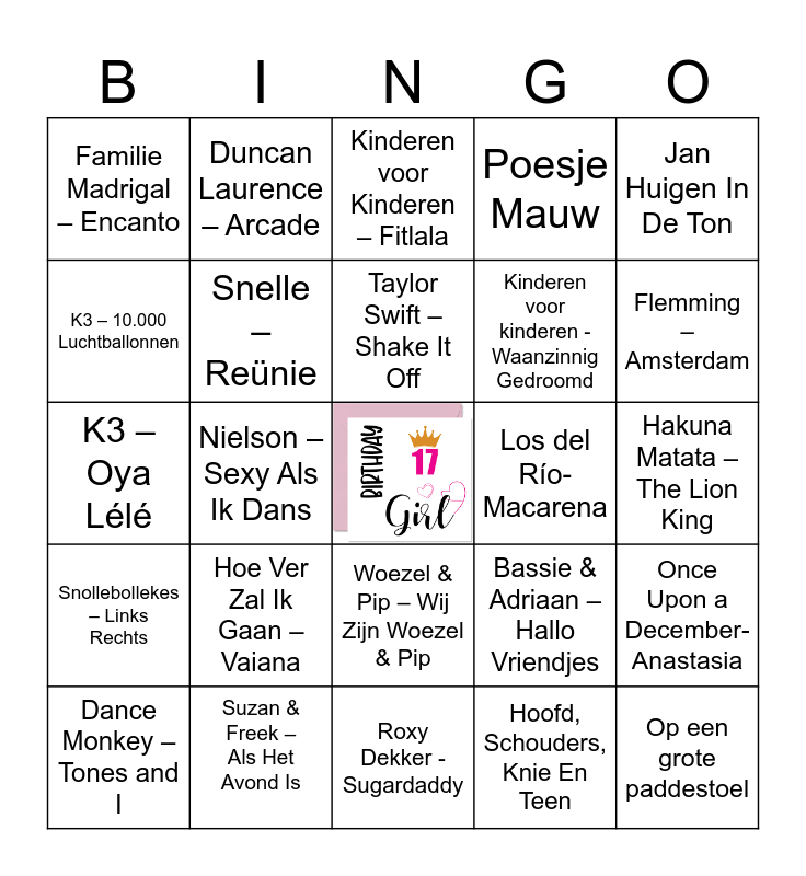 This bingo card has a free space and 29 words: Dance Monkey – Tones and I, In De Maneschijn, Nielson – Sexy Als Ik Dans, Klap Eens In Je Handjes, Familie Madrigal – Encanto, Kinderen voor Kinderen – Fitlala, Snelle – Reünie, Hoe Ver Zal Ik Gaan – Vaiana, Los del Río- Macarena, Suzan & Freek – Als Het Avond Is, Hakuna Matata – The Lion King, Op een grote paddestoel, Roxy Dekker -Sugardaddy, Hoofd, Schouders, Knie En Teen, Flemming – Amsterdam, Pinkfong- Babyshark, Woezel & Pip – Wij Zijn Woezel & Pip, Snollebollekes – Links Rechts, Jan Huigen In De Ton, K3 – Oya Lélé, Bassie & Adriaan – Hallo Vriendjes, Laat Het Los – Frozen, Kinderen voor kinderen -Waanzinnig Gedroomd, K3 – 10.000 Luchtballonnen, Poesje Mauw, Duncan Laurence – Arcade, Once Upon a December- Anastasia, Taylor Swift – Shake It Off and Kinderen voor kinderen- op een onbewoond eiland.