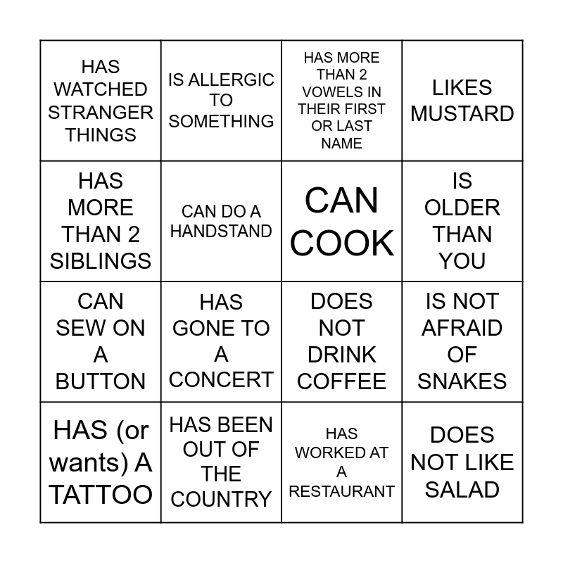 This bingo card has 16 words: HAS (or wants) A TATTOO, HAS BEEN OUT OF THE COUNTRY, HAS MORE THAN 2 VOWELS IN THEIR FIRST OR LAST NAME, LIKES MUSTARD, HAS MORE THAN 2 SIBLINGS, IS ALLERGIC TO SOMETHING, DOES NOT DRINK COFFEE, IS NOT AFRAID OF SNAKES, HAS WATCHED STRANGER THINGS, CAN DO A HANDSTAND, HAS WORKED AT A RESTAURANT, IS OLDER THAN YOU, CAN SEW ON A BUTTON, HAS GONE TO A CONCERT, CAN COOK and DOES NOT LIKE SALAD.