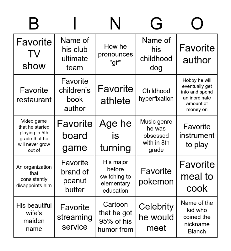 This bingo card has a free space and 24 words: Favorite brand of peanut butter, Favorite streaming service, Favorite athlete, His beautiful wife's maiden name, Favorite author, Favorite TV show, Favorite restaurant, Name of his club ultimate team, Music genre he was obsessed with in 8th grade, His major before switching to elementary education, Childhood hyperfixation, Video game that he started playing in 5th grade that he will never grow out of, Favorite pokemon, Favorite meal to cook, Favorite children's book author, Celebrity he would meet, Favorite instrument to play, How he pronounces "gif", Hobby he will eventually get into and spend an inordinate amount of money on, Favorite board game, Name of the kid who coined the nickname Blanch, An organization that consistently disappoints him, Name of his childhood dog and Cartoon that he got 95% of his humor from.