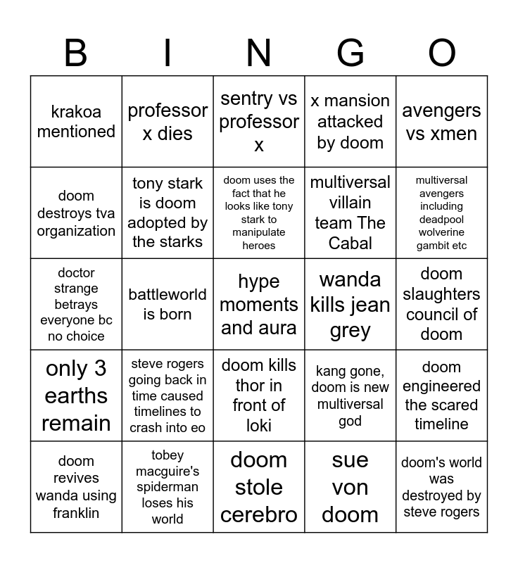This bingo card has a free space and 24 words: steve rogers going back in time caused timelines to crash into eo, tobey macguire's spiderman loses his world, doom uses the fact that he looks like tony stark to manipulate heroes, doom revives wanda using franklin, avengers vs xmen, krakoa mentioned, doom destroys tva organization, professor x dies, wanda kills jean grey, doom kills thor in front of loki, multiversal villain team The Cabal, doctor strange betrays everyone bc no choice, kang gone, doom is new multiversal god, doom engineered the scared timeline, tony stark is doom adopted by the starks, sue von doom, doom slaughters council of doom, sentry vs professor x, multiversal avengers including deadpool wolverine gambit etc, battleworld is born, doom's world was destroyed by steve rogers, only 3 earths remain, x mansion attacked by doom and doom stole cerebro.