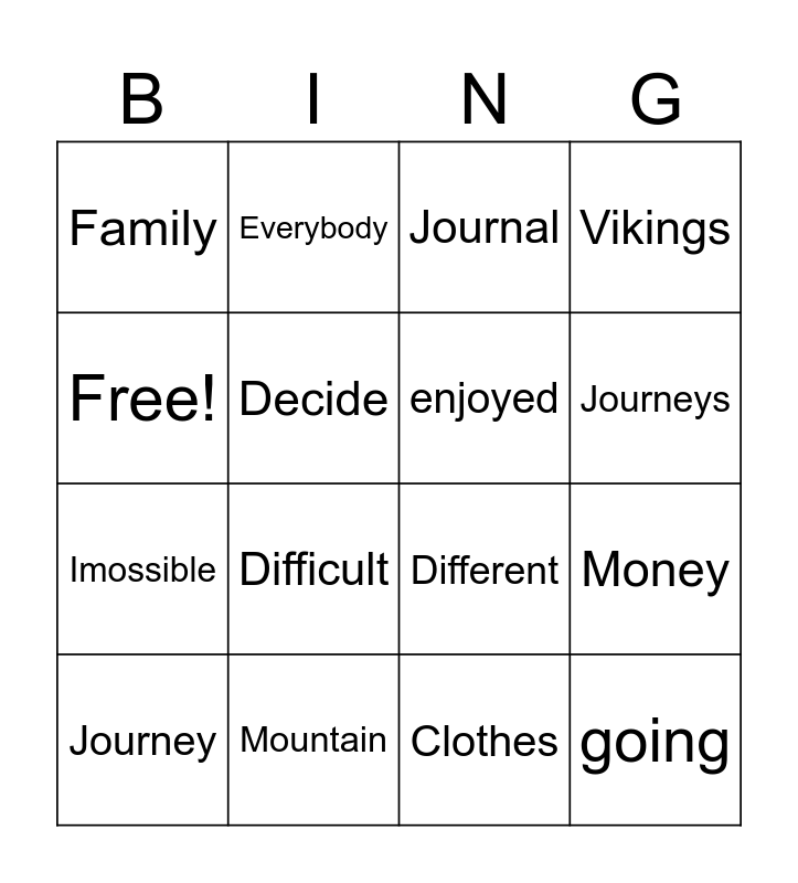 This bingo card has 16 words: Mountain, Money, Journal, Family, Imossible, Everybody, Different, Clothes, Free!, Decide, Journey, Vikings, Difficult, Journeys, enjoyed and going.