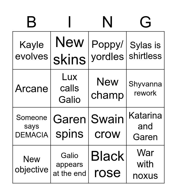This bingo card has 18 words: Arcane, Morgana vs Kayle, Poppy/ yordles, Sylas is shirtless, Someone says DEMACIA, New skins, Swain crow, Shyvanna rework, Kayle evolves, Garen spins, Black rose, Katarina and Garen, New objective, Lux calls Galio, New champ, War with noxus, Galio appears at the end and J4 cries that Xin is dead.