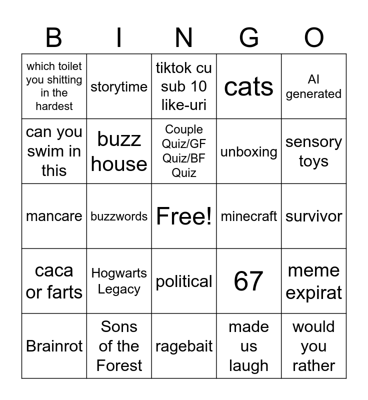This bingo card has a free space and 24 words: Hogwarts Legacy, Sons of the Forest, Couple Quiz/GF Quiz/BF Quiz, Brainrot, AI generated, which toilet you shitting in the hardest, can you swim in this, storytime, minecraft, political, unboxing, mancare, 67, meme expirat, buzz house, made us laugh, survivor, tiktok cu sub 10 like-uri, sensory toys, buzzwords, would you rather, caca or farts, cats and ragebait.