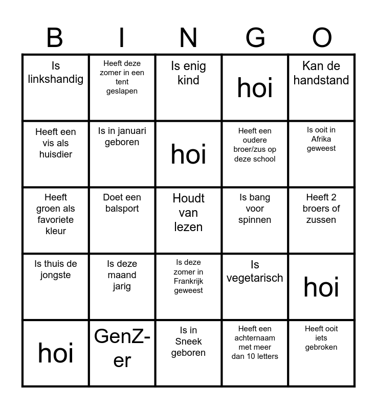 This bingo card has 30 words: GenZ-er, Werkt, Doet een balsport, Heeft een kat als huisdier, Is linkshandig, Is enig kind, Is in januari geboren, Is deze zomer in Frankrijk geweest, Is bang voor spinnen, Is in Sneek geboren, Heeft 2 broers of zussen, Houdt van lezen, Heeft een achternaam met meer dan 10 letters, Heeft ooit iets gebroken, Is ooit in Afrika geweest, Heeft een hond als huisdier, Is vegetarisch, Is thuis de jongste, Is deze maand jarig, Kan de handstand, Heeft groen als favoriete kleur, Spreekt thuis Fries, Heeft deze zomer in een tent geslapen, Heeft een oudere broer/zus op deze school, Heeft een vis als huisdier, hoi, hoi, hoi, hoi and hoi.