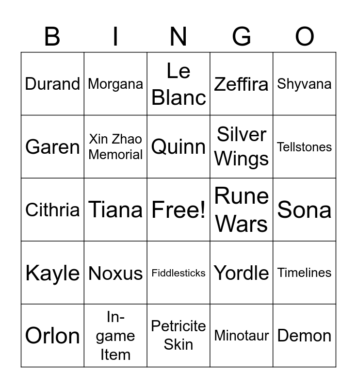 This bingo card has a free space and 24 words: Noxus, In-game Item, Quinn, Orlon, Shyvana, Durand, Garen, Morgana, Rune Wars, Fiddlesticks, Silver Wings, Cithria, Yordle, Timelines, Xin Zhao Memorial, Minotaur, Sona, Le Blanc, Tellstones, Tiana, Demon, Kayle, Zeffira and Petricite Skin.