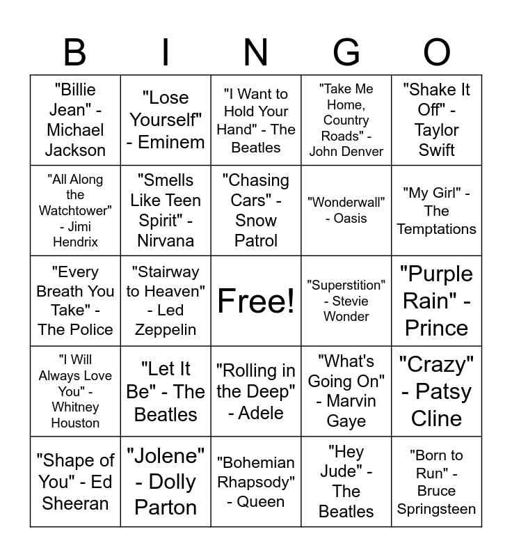 This bingo card has a free space and 31 words: "Bohemian Rhapsody" - Queen, "Imagine" - John Lennon, "Stairway to Heaven" - Led Zeppelin, "Hotel California" - Eagles, "Billie Jean" - Michael Jackson, "I Want to Hold Your Hand" - The Beatles, "Smells Like Teen Spirit" - Nirvana, "What's Going On" - Marvin Gaye, "Superstition" - Stevie Wonder, "Hey Jude" - The Beatles, "Purple Rain" - Prince, "Born to Run" - Bruce Springsteen, "Dancing Queen" - ABBA, "Good Vibrations" - The Beach Boys, "My Girl" - The Temptations, "Respect" - Aretha Franklin, "Crazy" - Patsy Cline, "Let It Be" - The Beatles, "I Will Always Love You" - Whitney Houston, "Rolling in the Deep" - Adele, "Shake It Off" - Taylor Swift, "Uptown Funk" - Mark Ronson ft. Bruno Mars, "Shape of You" - Ed Sheeran, "Lose Yourself" - Eminem, "Wonderwall" - Oasis, "All Along the Watchtower" - Jimi Hendrix, "Take Me Home, Country Roads" - John Denver, "Every Breath You Take" - The Police, "Jolene" - Dolly Parton, "Chasing Cars" - Snow Patrol and "Rolling in the Deep" - Adele.