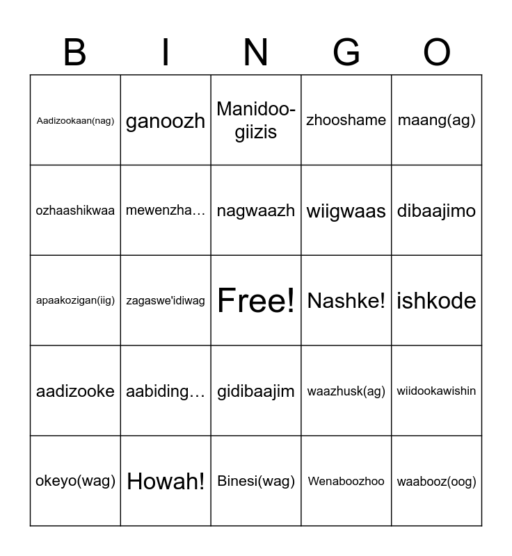 This bingo card has a free space and 29 words: okeyo(wag), Aaniin ezhiwebak agwajiing?, zagaswe'idiwag, Apegish menoseyeg, Aadizookaan(nag), Manidoo-giizis, mewenzha…, aabiding…, Nashke!, Howah!, ishkode, waabooz(oog), Binesi(wag), Wenaboozhoo, dibaajimo, indibaajim, gidibaajim, aadizooke, maang(ag), apaakozigan(iig), waazhusk(ag), gijigijigaaneshiinh(yag), wiigwaas, ozhaashikwaa, zhooshame, ganoozh, wiidookawishin, nagwaazh and akwa'waa.