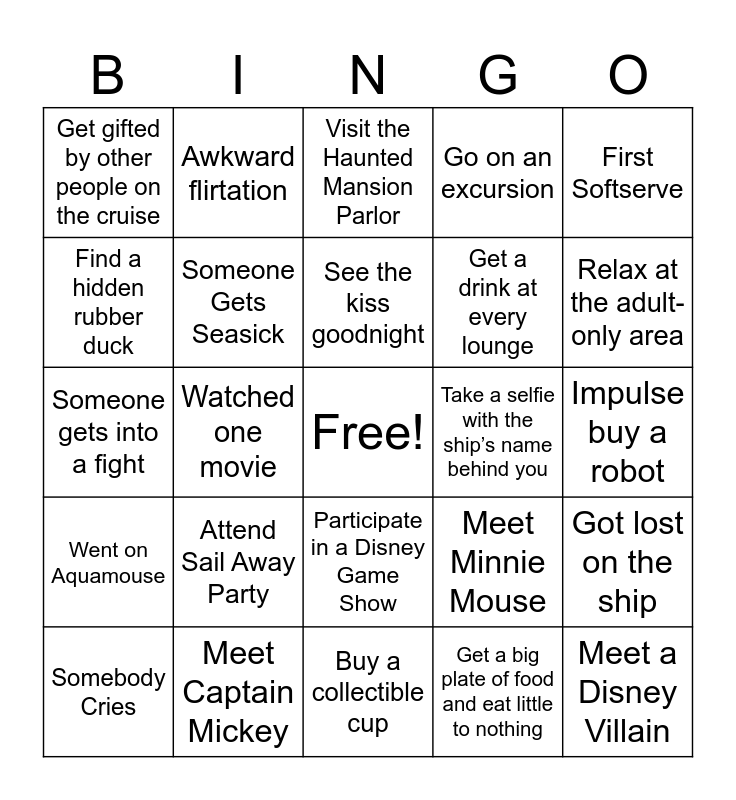 This bingo card has a free space and 33 words: First time eating Mickey waffles, Watch a Broadway-style show, Watched one movie, Got Drunk in a Pirate Costume, Went on Aquamouse, Someone Gets Seasick, First Softserve, Somebody Cries, Awkward flirtation, Meet Donald Duck, See the kiss goodnight, Visit the Haunted Mansion Parlor, Trade pins or collect a new souvenir, Hear the ship’s horn play "When You Wish Upon a Star", Take a selfie with the ship’s name behind you, Relax at the adult-only area, Meet Captain Mickey, Someone gets into a fight, Attend Sail Away Party, Meet Minnie Mouse, Participate in a Disney Game Show, Arrive late to a group event, Get gifted by other people on the cruise, Impulse buy a robot, Buy a collectible cup, Meet a Disney Villain, Go on an excursion, Get a drink at every lounge, Find a hidden rubber duck, Got lost on the ship, Order Room service, Get a big plate of food and eat little to nothing and Castaway cay 5k!.