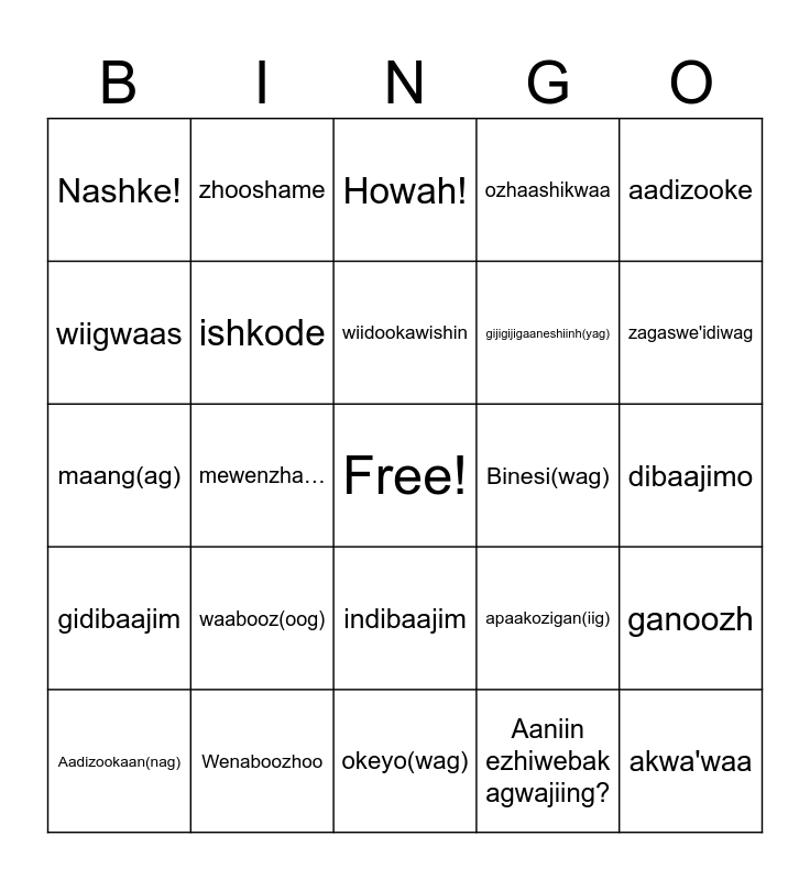 This bingo card has a free space and 29 words: Aadizookaan(nag), Manidoo-giizis, mewenzha…, aabiding…, Nashke!, Howah!, ishkode, waabooz(oog), Binesi(wag), Wenaboozhoo, dibaajimo, akwa'waa, okeyo(wag), Aaniin ezhiwebak agwajiing?, zagaswe'idiwag, Apegish menoseyeg, indibaajim, gidibaajim, aadizooke, maang(ag), apaakozigan(iig), waazhusk(ag), gijigijigaaneshiinh(yag), wiigwaas, ozhaashikwaa, zhooshame, ganoozh, wiidookawishin and nagwaazh.