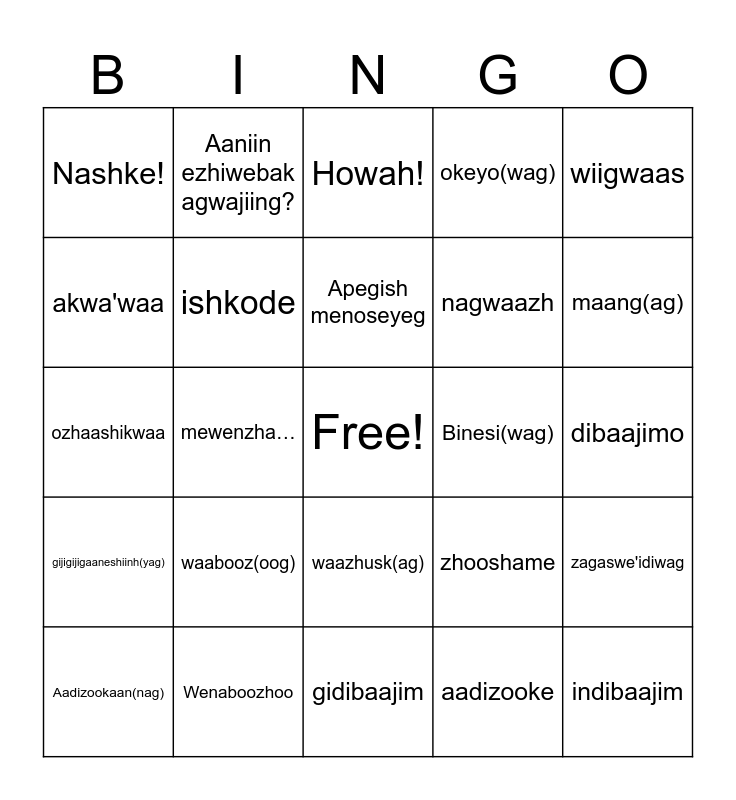 This bingo card has a free space and 29 words: Aadizookaan(nag), Manidoo-giizis, mewenzha…, aabiding…, Nashke!, Howah!, ishkode, waabooz(oog), Binesi(wag), Wenaboozhoo, dibaajimo, indibaajim, gidibaajim, aadizooke, maang(ag), apaakozigan(iig), waazhusk(ag), gijigijigaaneshiinh(yag), wiigwaas, ozhaashikwaa, zhooshame, wiidookawishin, nagwaazh, akwa'waa, okeyo(wag), Aaniin ezhiwebak agwajiing?, zagaswe'idiwag, Apegish menoseyeg and ganoozh.