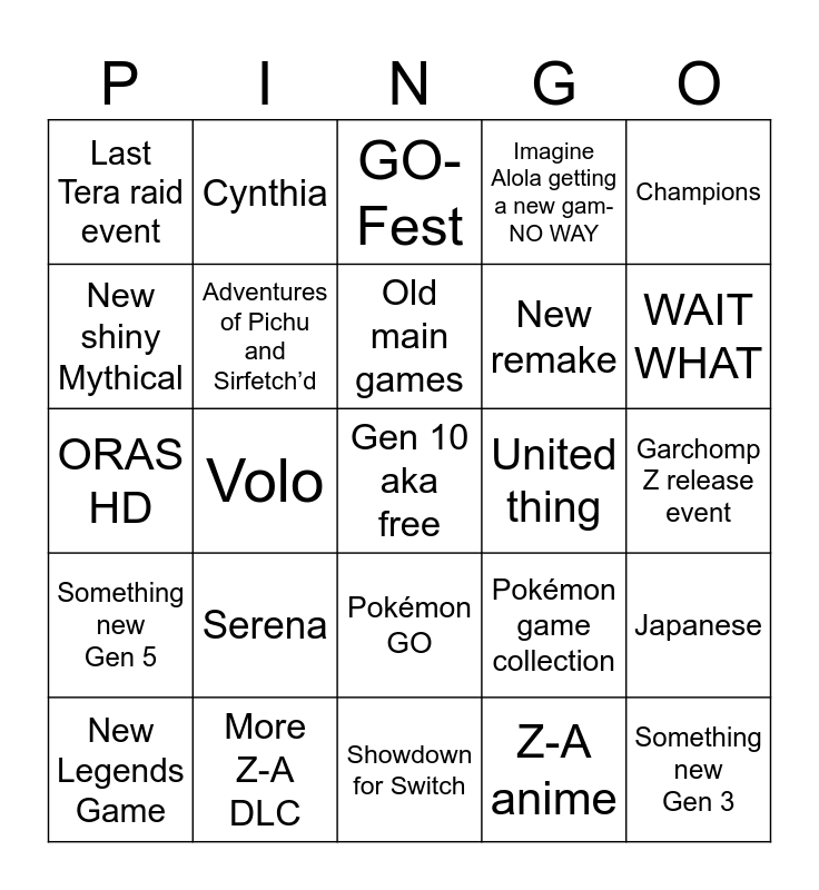 This bingo card has a free space and 24 words: Serena, More Z-A DLC, Old main games, New Legends Game, Champions, Last Tera raid event, New shiny Mythical, Cynthia, United thing, Pokémon GO, New remake, ORAS HD, Pokémon game collection, Japanese, Adventures of Pichu and Sirfetch’d, Z-A anime, Garchomp Z release event, GO-Fest, WAIT WHAT, Volo, Something new Gen 3, Something new Gen 5, Imagine Alola getting a new gam- NO WAY and Showdown for Switch.