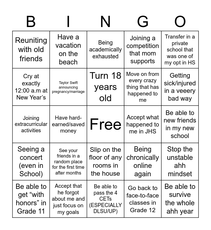 This bingo card has a free space and 24 words: Be able to get “with honors” in Grade 11, See your friends in a random place for the first time after months, Turn 18 years old, Go back to face-to-face classes in Grade 12, Transfer in a private school that was one of my opt in HS, Reuniting with old friends, Have a vacation on the beach, Being academically exhausted, Accept what happened to me in JHS, Be able to new friends in my new school, Joining extracurricular activities, Taylor Swift announcing pregnancy/marriage, Being chronically online again, Stop the unstable ahh mindset, Cry at exactly 12:00 a.m at New Year’s, Accept that he forgot about me and just focus on my goals, Be able to pass the 4 CETs (ESPECIALLY DLSU/UP), Joining a competition that mom supports, Getting sick/injured in a veeery bad way, Seeing a concert (even in School), Have hard-earned/saved money, Slip on the floor of any rooms in the house, Move on from every crazy thing that has happened to me and Be able to survive the whole ahh year.