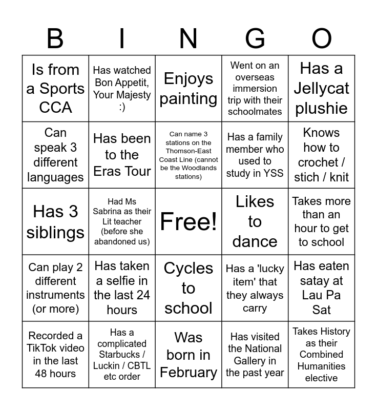 This bingo card has a free space and 24 words: Has taken a selfie in the last 24 hours, Has a complicated Starbucks / Luckin / CBTL etc order, Can name 3 stations on the Thomson-East Coast Line (cannot be the Woodlands stations), Recorded a TikTok video in the last 48 hours, Has a Jellycat plushie, Is from a Sports CCA, Can speak 3 different languages, Has watched Bon Appetit, Your Majesty :), Likes to dance, Cycles to school, Has a family member who used to study in YSS, Has 3 siblings, Has a 'lucky item' that they always carry, Has eaten satay at Lau Pa Sat, Has been to the Eras Tour, Has visited the National Gallery in the past year, Takes more than an hour to get to school, Enjoys painting, Knows how to crochet / stich / knit, Had Ms Sabrina as their Lit teacher (before she abandoned us), Takes History as their Combined Humanities elective, Can play 2 different instruments (or more), Went on an overseas immersion trip with their schoolmates and Was born in February.
