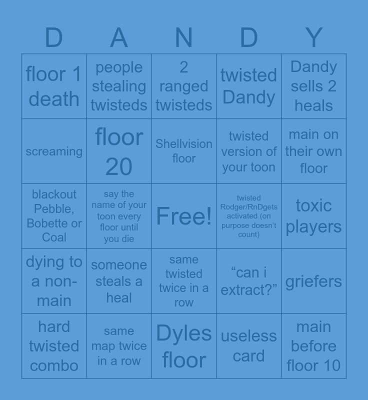 This bingo card has a free space and 24 words: someone steals a heal, same map twice in a row, Shellvision floor, hard twisted combo, Dandy sells 2 heals, floor 1 death, screaming, people stealing twisteds, twisted Rodger/RnDgets activated (on purpose doesn’t count), same twisted twice in a row, twisted version of your toon, blackout Pebble, Bobette or Coal, “can i extract?”, griefers, floor 20, useless card, toxic players, 2 ranged twisteds, main on their own floor, say the name of your toon every floor until you die, main before floor 10, dying to a non-main, twisted Dandy and Dyles floor.