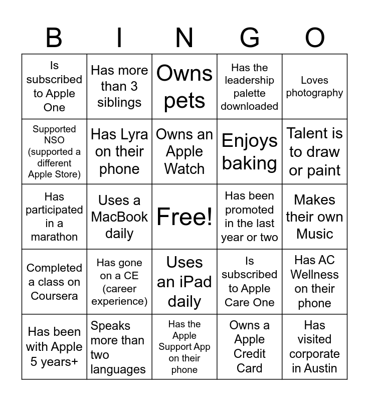 This bingo card has a free space and 24 words: Has gone on a CE (career experience), Speaks more than two languages, Owns an Apple Watch, Has been with Apple 5 years+, Loves photography, Is subscribed to Apple One, Supported NSO (supported a different Apple Store), Has more than 3 siblings, Has been promoted in the last year or two, Uses an iPad daily, Enjoys baking, Has participated in a marathon, Is subscribed to Apple Care One, Has AC Wellness on their phone, Has Lyra on their phone, Owns a Apple Credit Card, Makes their own Music, Owns pets, Talent is to draw or paint, Uses a MacBook daily, Has visited corporate in Austin, Completed a class on Coursera, Has the leadership palette downloaded and Has the Apple Support App on their phone.