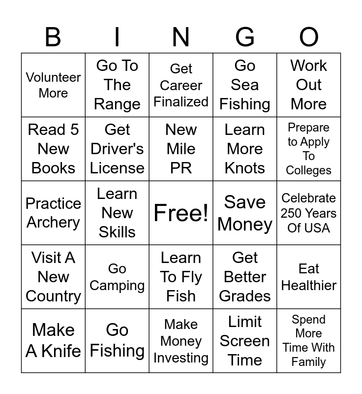 This bingo card has a free space and 24 words: Go Camping, Go Fishing, New Mile PR, Make A Knife, Work Out More, Volunteer More, Read 5 New Books, Go To The Range, Save Money, Learn To Fly Fish, Learn More Knots, Practice Archery, Get Better Grades, Eat Healthier, Get Driver's License, Limit Screen Time, Celebrate 250 Years Of USA, Get Career Finalized, Prepare to Apply To Colleges, Learn New Skills, Spend More Time With Family, Visit A New Country, Go Sea Fishing and Make Money Investing.