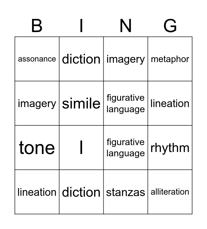 This bingo card has 30 words: Free!, rhyme, rhythm, alliteration, assonance, imagery, figurative language, symbolism, diction, tone, stanzas, lineation, form, stanzas, l, rhyme, rhythm, alliteration, assonance, imagery, figurative language, symbolism, diction, tone, simile, metaphor, personification, stanzas, lineation and form.