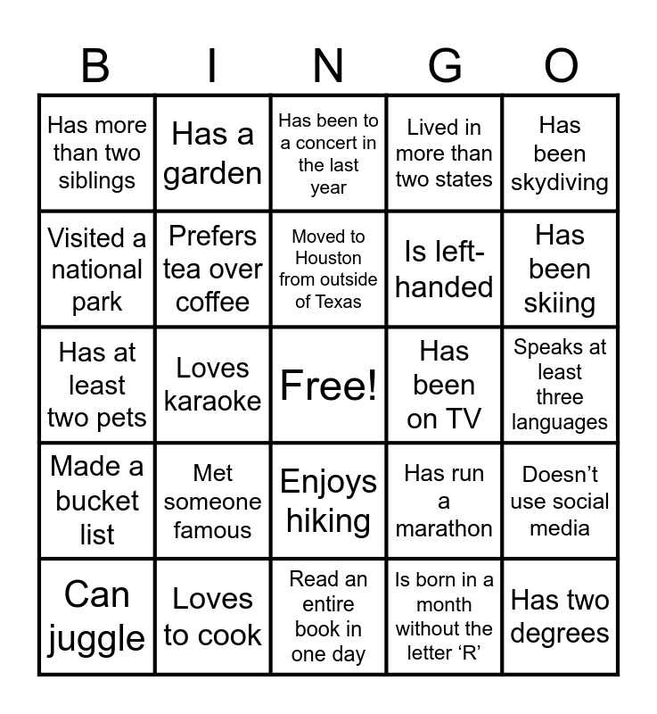 This bingo card has a free space and 24 words: Met someone famous, Loves to cook, Moved to Houston from outside of Texas, Can juggle, Has been skydiving, Has more than two siblings, Visited a national park, Has a garden, Has been on TV, Enjoys hiking, Is left-handed, Has at least two pets, Has run a marathon, Doesn’t use social media, Prefers tea over coffee, Is born in a month without the letter ‘R’, Speaks at least three languages, Has been to a concert in the last year, Has been skiing, Loves karaoke, Has two degrees, Made a bucket list, Lived in more than two states and Read an entire book in one day.