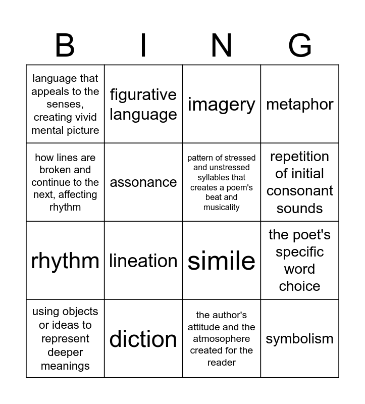 This bingo card has 28 words: Free!, rhyme, rhythm, alliteration, assonance, imagery, figurative language, symbolism, diction, tone, simile, metaphor, personification, stanzas, lineation, form, repetition of similar sounds, often at the end of lines, pattern of stressed and unstressed syllables that creates a poem's beat and musicality, repetition of initial consonant sounds, repetition of vowel sounds either within words or at the beginning of the words, language that appeals to the senses, creating vivid mental picture, comparisons and creative language like similes, metaphors, and personification, using objects or ideas to represent deeper meanings, the poet's specific word choice, the author's attitude and the atmosophere created for the reader, groups of lines, like paragraphs in prose, how lines are broken and continue to the next, affecting rhythm and the overall shape or structure (e.g. sonnet, haiku, free verse).
