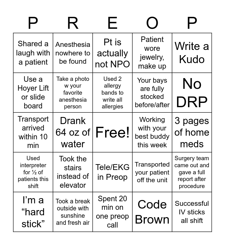 This bingo card has a free space and 24 words: Took the stairs instead of elevator, Took a break outside with sunshine and fresh air, Used 2 allergy bands to write all allergies, I’m a “hard stick”, Write a Kudo, Shared a laugh with a patient, Use a Hoyer Lift or slide board, Anesthesia nowhere to be found, Working with your best buddy this week, Tele/EKG in Preop, Your bays are fully stocked before/after, Transport arrived within 10 min, Transported your patient off the unit, Surgery team came out and gave a full report after procedure, Take a photo w your favorite anesthesia person, Code Brown, 3 pages of home meds, Pt is actually not NPO, No DRP, Drank 64 oz of water, Successful IV sticks all shift, Used interpreter for ½ of patients this shift, Patient wore jewelry, make up and Spent 20 min on one preop call.