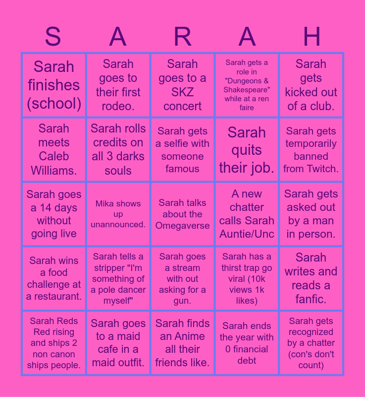 This bingo card has a free space and 24 words: Sarah tells a stripper "I'm something of a pole dancer myself", Sarah goes to a maid cafe in a maid outfit., Sarah gets a selfie with someone famous, Sarah Reds Red rising and ships 2 non canon ships people., Sarah gets kicked out of a club., Sarah finishes (school), Sarah meets Caleb Williams., Sarah goes to their first rodeo., A new chatter calls Sarah Auntie/Unc, Sarah goes a stream with out asking for a gun., Sarah quits their job., Sarah goes a 14 days without going live, Sarah has a thirst trap go viral (10k views 1k likes), Sarah writes and reads a fanfic., Sarah rolls credits on all 3 darks souls, Sarah ends the year with 0 financial debt, Sarah gets asked out by a man in person., Sarah goes to a SKZ concert, Sarah gets temporarily banned from Twitch., Mika shows up unannounced., Sarah gets recognized by a chatter (con's don't count), Sarah wins a food challenge at a restaurant., Sarah gets a role in "Dungeons & Shakespeare" while at a ren faire and Sarah finds an Anime all their friends like..