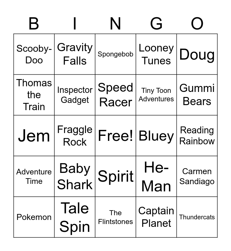 This bingo card has a free space and 56 words: Duck Tales, Pokemon, Teenage Mutant Ninja Turtles, Scooby-Doo, The Flintstones, The Jetsons, Inspector Gadget, The Pink Panther, Tiny Toon Adventures, Animaniacs, Looney Tunes, Rocky & Bullwinkle, The Muppet Show, The Snorks, Rugrats, Care Bears, Doug, Fraggle Rock, Tom and Jerry, Thundercats, Bluey, The Smurfs, He-Man, Spongebob, Rainbow Brite, Speed Racer, Strawberry Shortcake, Pink & the Brain, Gummi Bears, PAW Patrol, Yogi Bear, G.I. Joe, Peanuts, Popeye, Reading Rainbow, Thomas the Train, Jem, Gumball, Adventure Time, Gravity Falls, Spirit, Veggie Tales, Darkwing Duck, Chip 'N' Dale's Rescue Rangers, Mickey Mouse Clubhouse, Baby Shark, Tale Spin, Dora, Johnny Bravo, Dexter's Laboratory, Captain Planet, Power Rangers, George of the Jungle, The Loud House, Carmen Sandiago and Fairly Odd Parents.