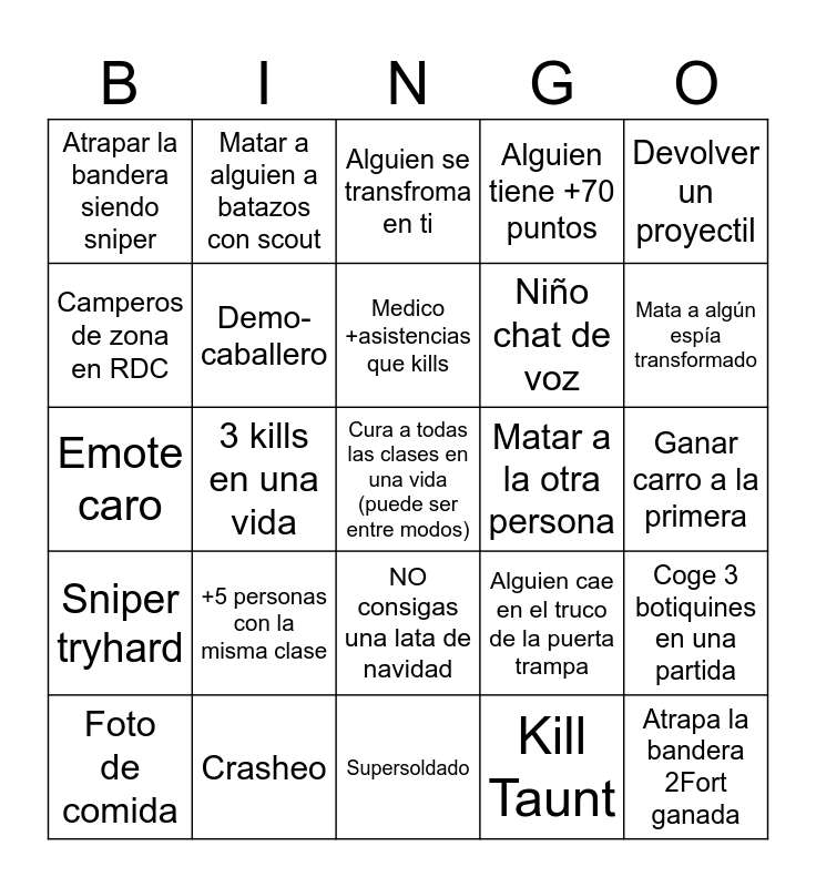 This bingo card has 39 words: Heavy Medic, Ingeniero Campero, Alguien de tu equipo tiene nombre raro, Niño chat de voz, Atrapa la bandera 2Fort ganada, Sniper tryhard, Demo-caballero, Alguien tiene racha de +5, Alguien tiene +70 puntos, Ganar carro a la primera, Camperos de zona en RDC, Matar a alguien a batazos con scout, Supersoldado, Alguien cae en el truco de la puerta trampa, Mata a algún espía transformado, Emote caro, +3 personas con 0 puntos al final, Alguien se transfroma en ti, Headshot a alguien, Coge 3 botiquines en una partida, Atrapar la bandera siendo sniper, +5 personas con la misma clase, Cura a todas las clases en una vida (puede ser entre modos), Matar a la otra persona, Hazte pasar por alguien por +3 mins, Foto de comida, Crasheo, Heavy pacifico, Speedrun atrapa la bandera, Devolver un proyectil, AFK, Musica en el chat de voz, Medico +asistencias que kills, Kill Taunt, Sappear, Hazte amigos con alguien rival, 3 kills en una vida, NO consigas una lata de navidad and No mates.