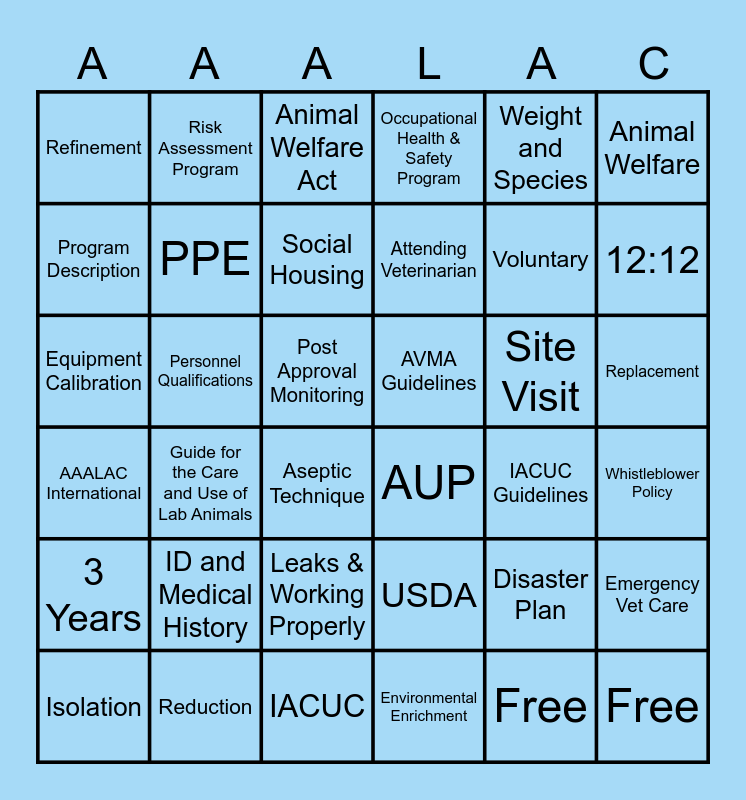 This bingo card has 36 words: AAALAC International, Guide for the Care and Use of Lab Animals, IACUC, Attending Veterinarian, Site Visit, Replacement, Refinement, Reduction, Animal Welfare Act, USDA, Voluntary, Animal Welfare, 3 Years, Personnel Qualifications, Social Housing, Occupational Health & Safety Program, Disaster Plan, Whistleblower Policy, Program Description, PPE, Aseptic Technique, AUP, IACUC Guidelines, Emergency Vet Care, Equipment Calibration, Risk Assessment Program, Post Approval Monitoring, Environmental Enrichment, Weight and Species, 12:12, Isolation, ID and Medical History, Leaks & Working Properly, AVMA Guidelines, Free and Free.