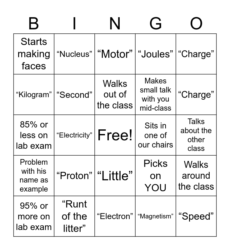 This bingo card has a free space and 50 words: “Force”, “Speed”, “Velocity”, “Electron”, “Proton”, “Neutron”, “Nucleus”, “Coulomb”, “Kilogram”, “Meter”, “Second”, “Joules”, Walks around the class, Picks on YOU, Uses a story to teach, “67”, Walks out of the class, Sits in one of our chairs, Sits in YOUR table group, “Charge”, “Electricity”, “Magnetism”, Starts making faces, Makes small talk with you mid-class, “Circuit”, “Fields”, “Charge”, “Electromagnetism”, “Motor”, “Little”, “Big”, Uses whiteboard, Bingo, Laughs, “Runt of the litter”, Talks about his life, “Epsilon”, “Alpha”/”Beta”, Any greek letter, Talks about the other class, End of period spare time, Mentions another teacher, Physical demonstration, “Lab exam”, 95% or more on lab exam, 85% or less on lab exam, Hints something being on the test, Whistles, Problem with his name as example and Problem with student’s name as example.