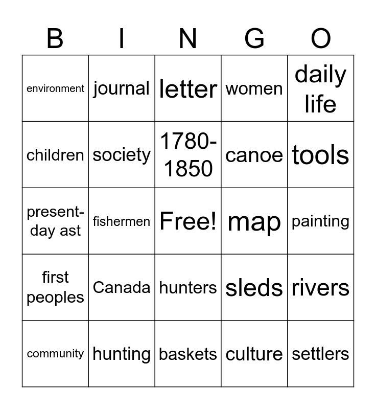 This bingo card has a free space and 24 words: community, Canada, 1780-1850, culture, daily life, environment, journal, letter, map, painting, present-day ast, society, sleds, rivers, children, hunting, baskets, women, tools, first peoples, fishermen, hunters, canoe and settlers.