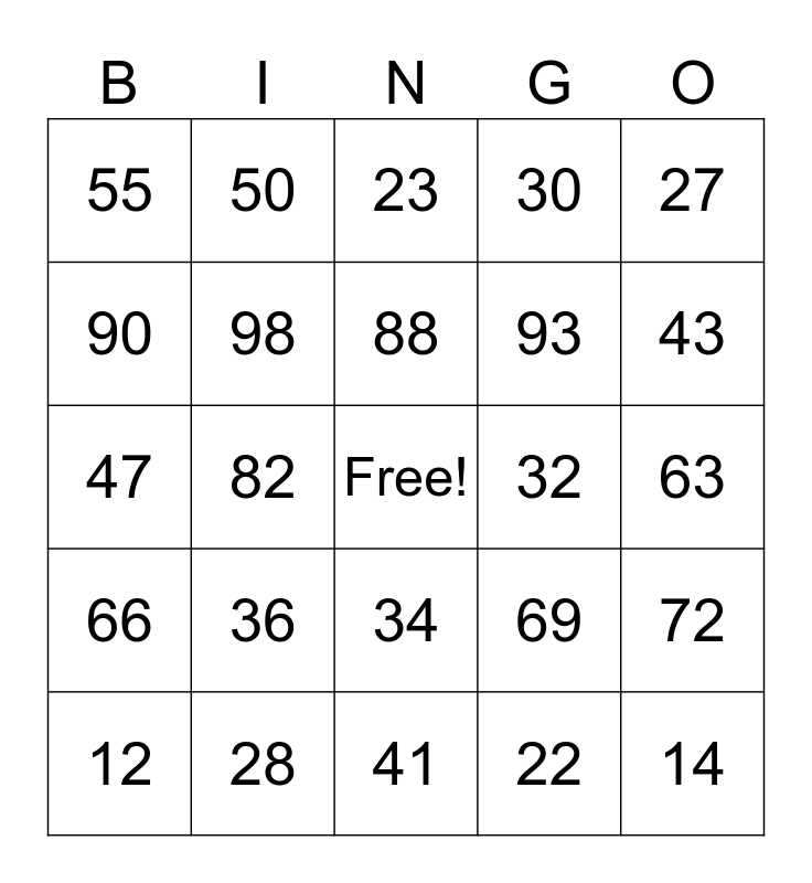 This bingo card has a free space and 45 words: 13, 14, 17, 12, 19, 22, 23, 25, 27, 28, 30, 32, 34, 36, 38, 41, 46, 47, 49, 43, 50, 52, 54, 55, 59, 63, 65, 68, 69, 66, 71, 72, 74, 76, 78, 82, 83, 85, 87, 88, 90, 93, 96, 98 and 99.