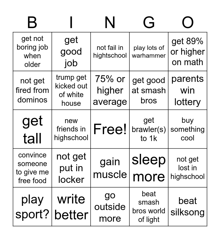 This bingo card has a free space and 24 words: not get put in locker, write better, 75% or higher average, play sport?, get 89% or higher on math, get not boring job when older, not get fired from dominos, get good job, get brawler(s) to 1k, gain muscle, get good at smash bros, get tall, sleep more, not get lost in highschool, trump get kicked out of white house, beat smash bros world of light, buy something cool, not fail in hightschool, parents win lottery, new friends in highschool, beat silksong, convince someone to give me free food, play lots of warhammer and go outside more.