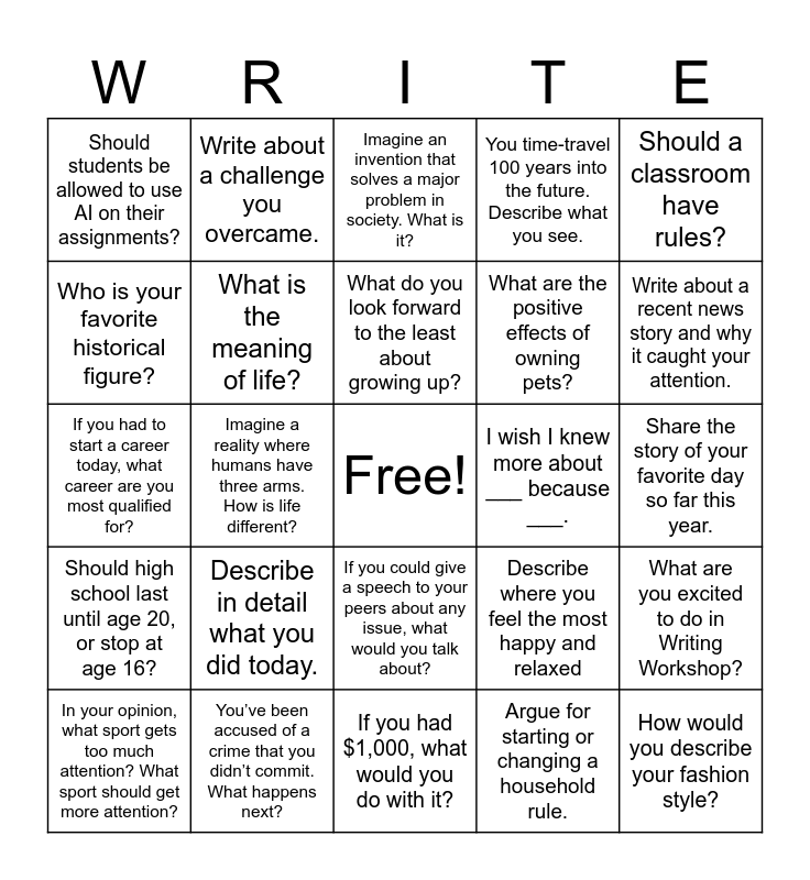 This bingo card has a free space and 24 words: Describe in detail what you did today., You’ve been accused of a crime that you didn’t commit. What happens next?, What do you look forward to the least about growing up?, In your opinion, what sport gets too much attention? What sport should get more attention?, Should a classroom have rules?, Should students be allowed to use AI on their assignments?, Who is your favorite historical figure?, Write about a challenge you overcame., I wish I knew more about ___ because ___., If you could give a speech to your peers about any issue, what would you talk about?, What are the positive effects of owning pets?, If you had to start a career today, what career are you most qualified for?, Describe where you feel the most happy and relaxed, What are you excited to do in Writing Workshop?, What is the meaning of life?, Argue for starting or changing a household rule., Share the story of your favorite day so far this year., Imagine an invention that solves a major problem in society. What is it?, Write about a recent news story and why it caught your attention., Imagine a reality where humans have three arms. How is life different?, How would you describe your fashion style?, Should high school last until age 20, or stop at age 16?, You time-travel 100 years into the future. Describe what you see. and If you had $1,000, what would you do with it?.