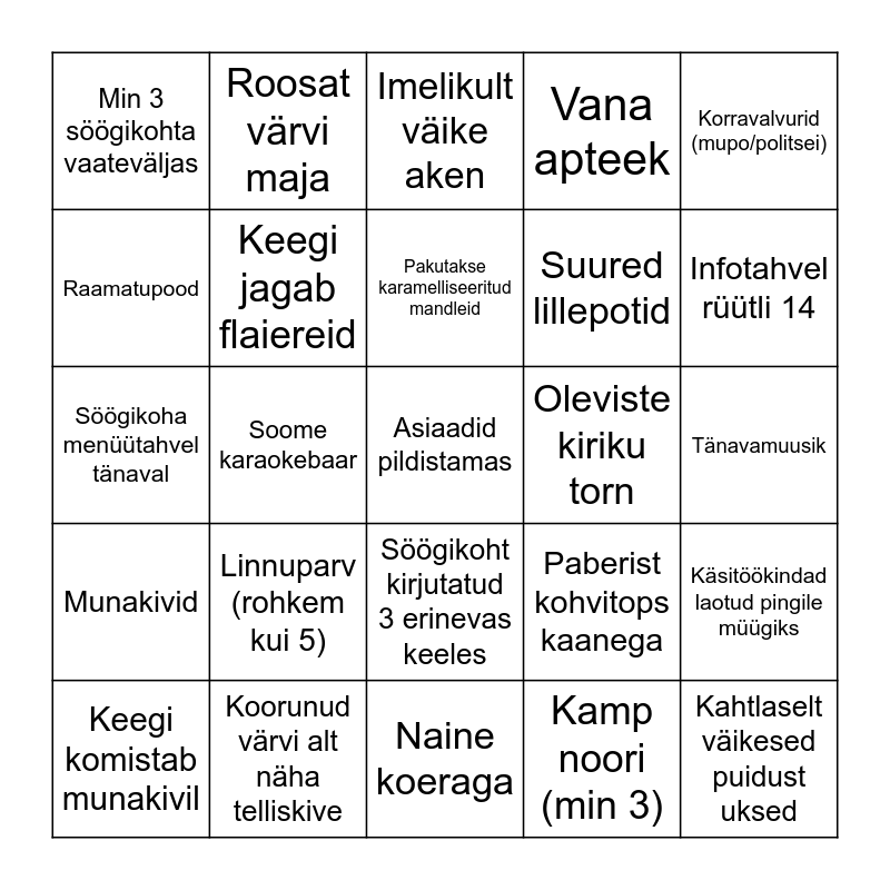 This bingo card has 52 words: Punt välismaa noormehi, Asiaadid pildistamas, Keegi minipannkooke söömas, Naine koeraga, Linnuparv (rohkem kui 5), Üksik graffiti beezikal seinal, Roosat värvi maja, Kajakas midagi söömas, Raamatupood, Musta jopega mees istub pingil, Keegi jagab flaiereid, Tänavamuusik, Käsitöökindad laotud pingile müügiks, Paberist kohvitops kaanega, Mees ja naine õues söömas, Kilekotiga inimene, Pakutakse karamelliseeritud mandleid, Oleviste kiriku torn, Eesti toodete müük, Korravalvurid (mupo/politsei), Soome karaokebaar, Kamp noori (min 3), Min 3 söögikohta vaateväljas, Suured lillepotid, Järsk trepp, Kahtlaselt väikesed puidust uksed, Aknal trellid ees, Aknal puust luugid ees, Infotahvel rüütli 14, Kollane graffiti, Kultuurimälestise märk, Vana apteek, 2 pildistavat inimest 10m raadiuses, Tupiktänav, Suured metallist väravad, Imelikult väike aken, Koorunud värvi alt näha telliskive, Võlts aken, Toidulõhn, Alkohoolne jook alla 5 euro, Keegi osutamas, Tänavamuusik, Munakivid, Pöörlev postkaartide stend, Söögikoht kirjutatud 3 erinevas keeles, Fotokas ripub kaelas, Teenindaja põllega, Söögikoha menüütahvel tänaval, Trepp ilma käsipuuta, Kuuled inglise keelt, Keegi komistab munakivil and Kari tuvisid või kajakaid.