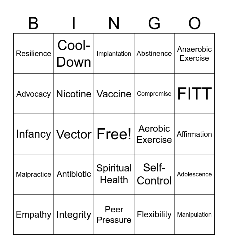 This bingo card has a free space and 54 words: Culture, Malpractice, Health, Prevention, Spiritual Health, Heredity, Abstinence, Conflict Resolution, Advocacy, Values, Resilience, Competence, Integrity, Empathy, Citizenship, Peer Pressure, Manipulation, Compromise, Assertive, Affirmation, Self-Control, Anorexia, Aerobic Exercise, Anaerobic Exercise, Calorie, Cool-Down, Cardiorespiratory Endurance, BMI, Muscular Endurance, Flexibility, Stretching, Ectopic Pregnancy, Prenatal Care, Miscarriage, Implantation, Fertilization, Infancy, Adolescence, Tobacco, Nicotine, Tar, Addiction, Drug, Medicine, Antibiotic, Antihistamine, Antiviral, Analgesics, Vaccine, Vector, FITT, RICE, Aspects of Health Triangle and Ratio of Adult CPR.