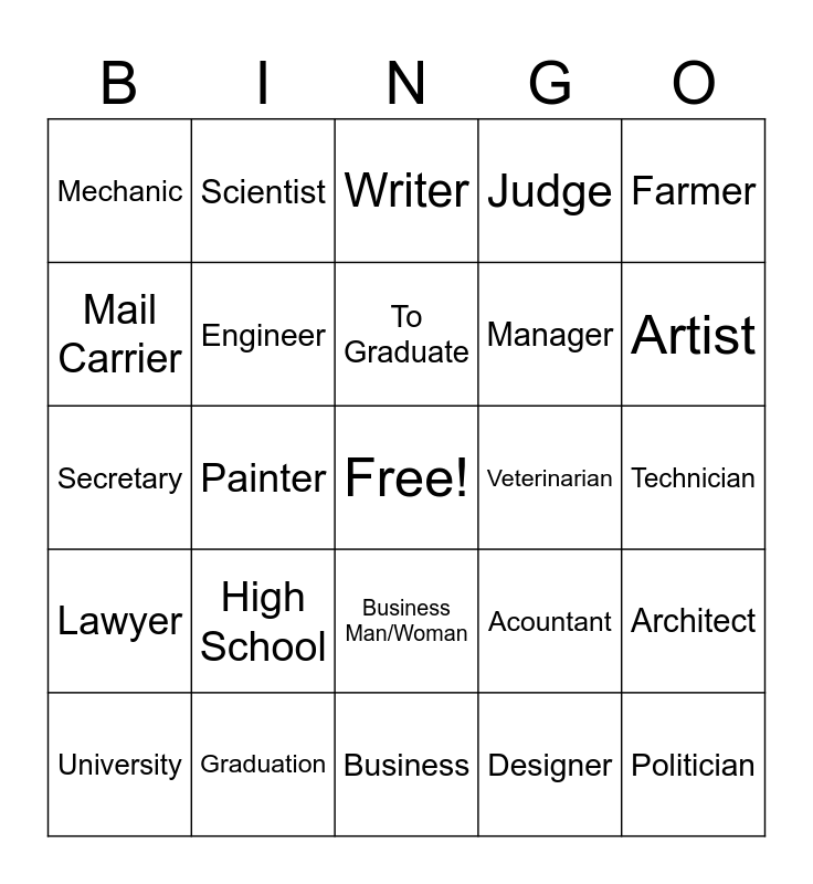 This bingo card has a free space and 24 words: High School, Graduation, To Graduate, University, Farmer, Mechanic, Mail Carrier, Scientist, Veterinarian, Business Man/Woman, Manager, Secretary, Acountant, Architect, Engineer, Designer, Technician, Writer, Artist, Painter, Politician, Lawyer, Judge and Business.