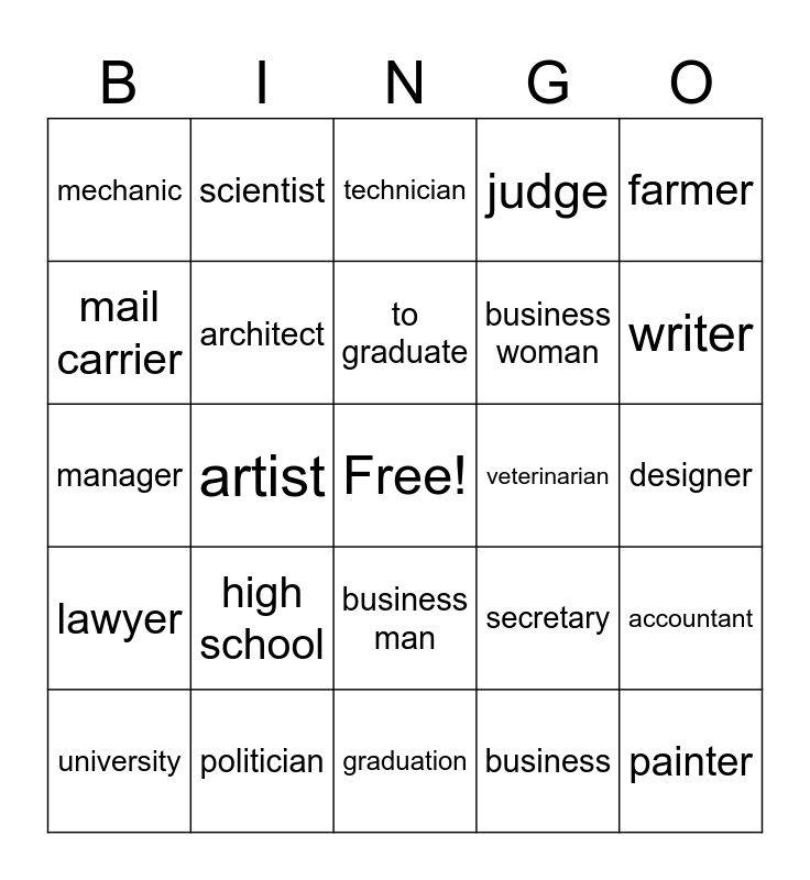 This bingo card has a free space and 25 words: high school, graduation, to graduate, university, farmer, mechanic, mail carrier, scientist, veterinarian, business man, business woman, manager, secretary, accountant, architect, engineer, designer, technician, writer, artist, painter, politician, lawyer, judge and business.