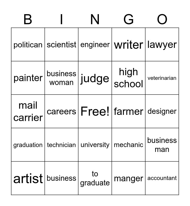 This bingo card has a free space and 24 words: technician, business, judge, artist, lawyer, politican, painter, scientist, farmer, university, high school, mail carrier, mechanic, business man, business woman, manger, designer, engineer, veterinarian, careers, accountant, graduation, writer and to graduate.