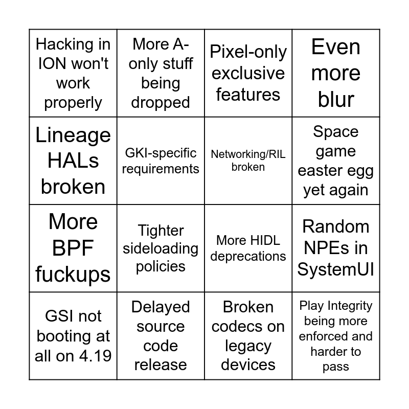 This bingo card has 16 words: Delayed source code release, Random NPEs in SystemUI, Pixel-only exclusive features, Hacking in ION won't work properly, More BPF fuckups, More A-only stuff being dropped, More HIDL deprecations, Broken codecs on legacy devices, Lineage HALs broken, GKI-specific requirements, GSI not booting at all on 4.19, Even more blur, Tighter sideloading policies, Space game easter egg yet again, Networking/RIL broken and Play Integrity being more enforced and harder to pass.