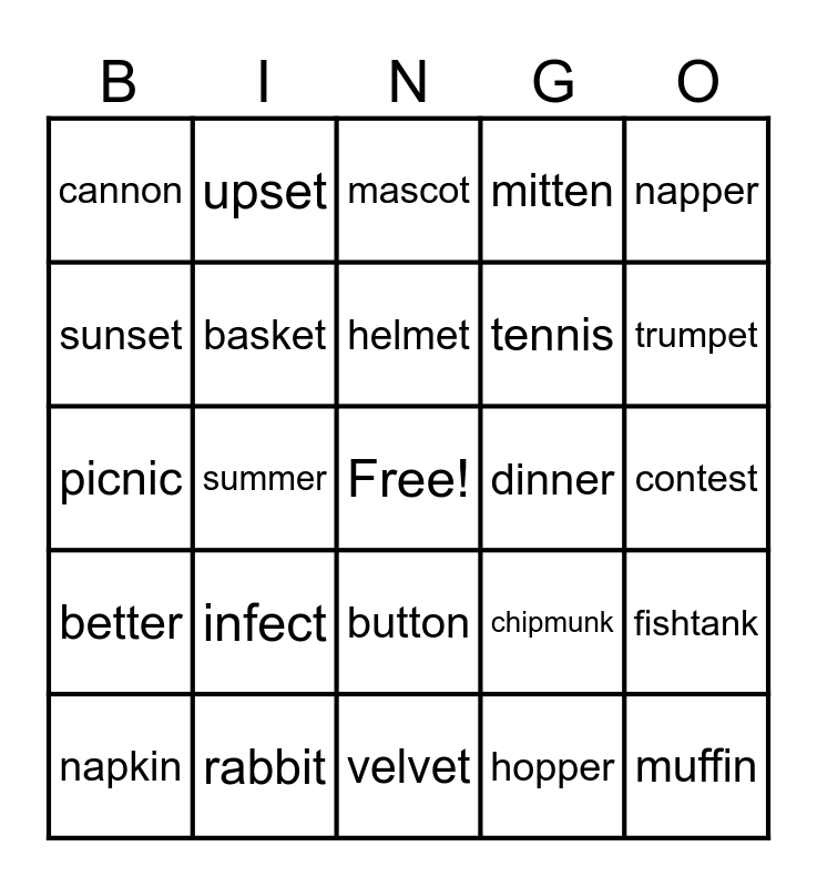 This bingo card has a free space and 35 words: rabbit, kitten, napkin, basket, button, mitten, sunset, magnet, helmet, pocket, picnic, napper, ladder, letter, cannon, dinner, hopper, summer, better, muffin, chipmunk, napkin, fishtank, rabbit, mascot, trumpet, goblet, absent, tennis, contest, bonnet, velvet, infect, upset and object.