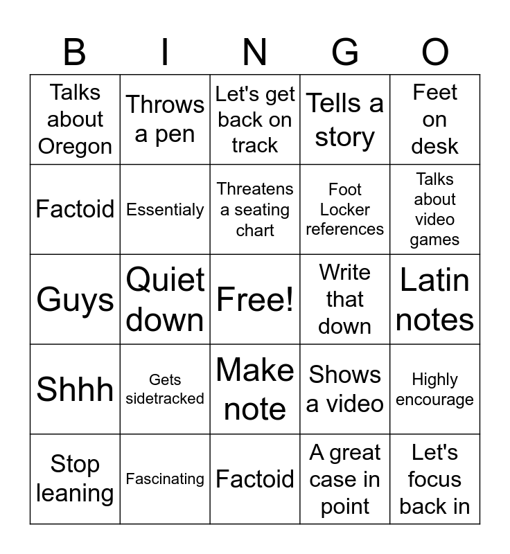 This bingo card has a free space and 24 words: Gets sidetracked, Fascinating, Threatens a seating chart, Stop leaning, Feet on desk, Talks about Oregon, Factoid, Throws a pen, Write that down, Make note, Foot Locker references, Guys, Shows a video, Highly encourage, Essentialy, A great case in point, Latin notes, Let's get back on track, Talks about video games, Quiet down, Let's focus back in, Shhh, Tells a story and Factoid.