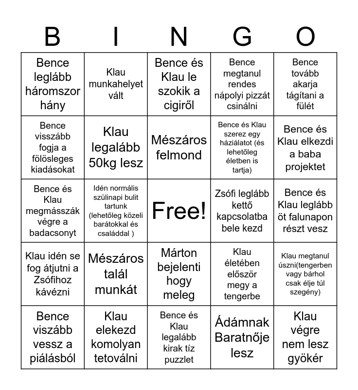 This bingo card has a free space and 24 words: Bence viszább vessz a piálásból, Mészáros talál munkát, Mészáros felmond, Ádámnak Baratnője lesz, Bence tovább akarja tágítani a fülét, Bence leglább háromszor hány, Klau munkahelyet vált, Bence és Klau le szokik a cigiről, Zsófi leglább kettő kapcsolatba bele kezd, Bence és Klau leglább öt falunapon részt vesz, Bence és Klau megmásszák végre a badacsonyt, Klau legalább 50kg lesz, Klau életében először megy a tengerbe, Klau megtanul úszni(tengerben vagy bárhol csak élje túl szegény), Bence visszább fogja a fölösleges kiadásokat, Klau elekezd komolyan tetoválni, Bence és Klau legalább kirak tíz puzzlet, Bence megtanul rendes nápolyi pizzát csinálni, Bence és Klau elkezdi a baba projektet, Klau idén se fog átjutni a Zsófihoz kávézni, Idén normális szülinapi bulit tartunk (lehetőleg közeli barátokkal és családdal ), Márton bejelenti hogy meleg, Bence és Klau szerez egy háziálatot (és lehetőleg életben is tartja) and Klau végre nem lesz gyökér.