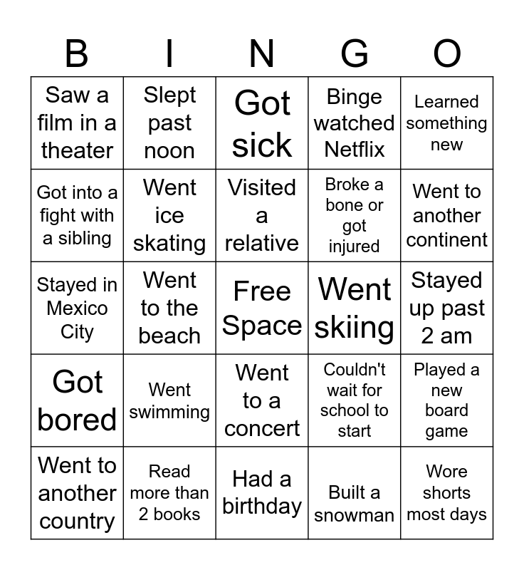 This bingo card has a free space and 24 words: Went swimming, Read more than 2 books, Visited a relative, Went to another country, Learned something new, Saw a film in a theater, Got into a fight with a sibling, Slept past noon, Went skiing, Went to a concert, Broke a bone or got injured, Stayed in Mexico City, Couldn't wait for school to start, Played a new board game, Went ice skating, Built a snowman, Stayed up past 2 am, Got sick, Went to another continent, Went to the beach, Wore shorts most days, Got bored, Binge watched Netflix and Had a birthday.