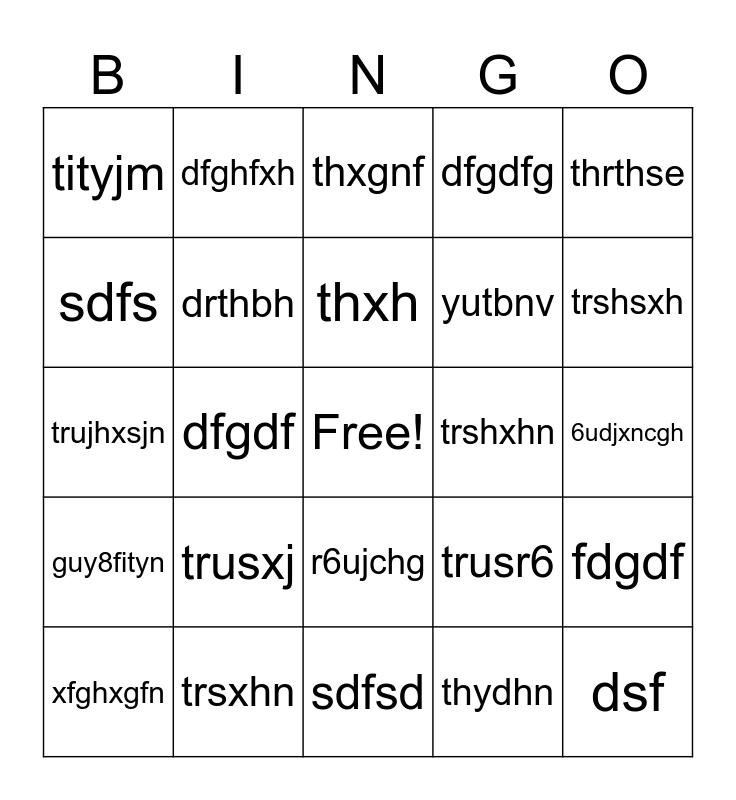 This bingo card has a free space and 34 words: dhtsrt, thydhn, judyjn, fhfg, guy8fityn, drthbh, thrthse, xfghxgfn, dfghfxh, fxbfg, thxh, thxgnf, ujyxfg, ytjuf, trshxhn, trshsxh, trsxhn, trujhxsjn, trusxj, trusr6, r6ujchg, tykchg, tityjm, 6udjxncgh, sdfsd, dsf, dfgdfg, bvnv, yutbnv, sdfs, dfgdfg, dfgdf, fdgdf and dfg.