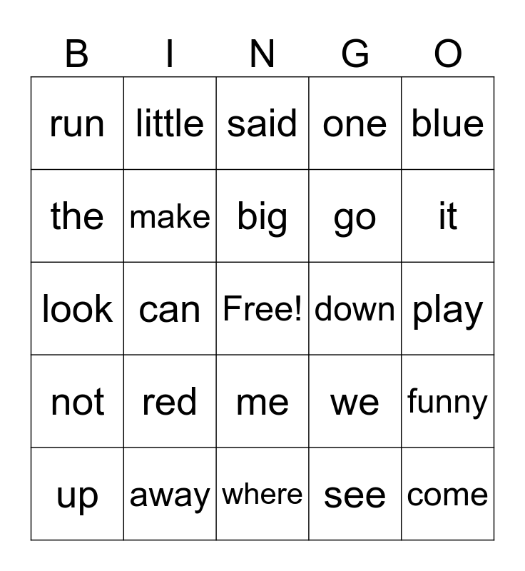 This bingo card has a free space and 40 words: a, look, and, make, away, me, big, my, blue, not, can, one, come, play, down, red, find, run, for, said, funny, see, go, the, help, three, here, to, I, two, in, up, is, we, it, where, jump, yellow, little and you.