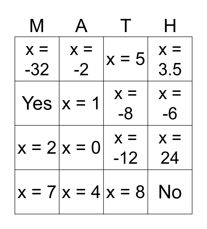 This bingo card has 16 words: x = 4, x = 24, x = 5, x = -32, x = 2, x = -2, x = -12, x = 8, Yes, x = 1, x = 7, x = 3.5, x = 0, x = -6, x = -8 and No.