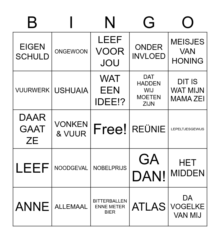 This bingo card has a free space and 50 words: BAILA DE GASOLINA, DA VOGELKE VAN MIJ, ECHTE LIEFDE IS TE KOOP, BITTERBALLEN ENNE METER BIER, NOODGEVAL, EROP OF ERONDER, ONGEWOON, SATISFYER, VUURWERK, SUGARDADDY, USHUAIA, ONDER INVLOED, HET MIDDEN, GA DAN!, ZILVER, ADEMNOOD, WAT EEN IDEE!?, REÜNIE, SLAPELOOSHEID, MEISJES VAN HONING, VONKEN & VUUR, ATLAS, EIGEN SCHULD, DAT HADDEN WIJ MOETEN ZIJN, STUKJE VAN MIJ, ZONDE, DIT IS WAT MIJN MAMA ZEI, LAAT ONS EEN BLOEM - UIT LIEFDE VOOR MUZIEK, LEEF VOOR JOU, NOBELPRIJS, ZONDER MIJ, ENERGIE, DE HOEKEN VAN DE KAMER, HET IS EEN NACHT, ALLEMAAL, IK NEEM JE MEE, UIT MIJN HOOFD, IK WIL JE, DROMEN ZIJN BEDROG, LEPELTJESGEWIJS, LAAT HET GRAS MAAR GROEIEN, DOMINO, HÉ LEKKER BEEST, BROOD VOOR MORGENVROEG, ANNE, DAAR GAAT ZE, ENGELBEWAARDER, ATJE VOOR DE SFEER, LEEF and ALS DE NACHT VERDWIJNT.